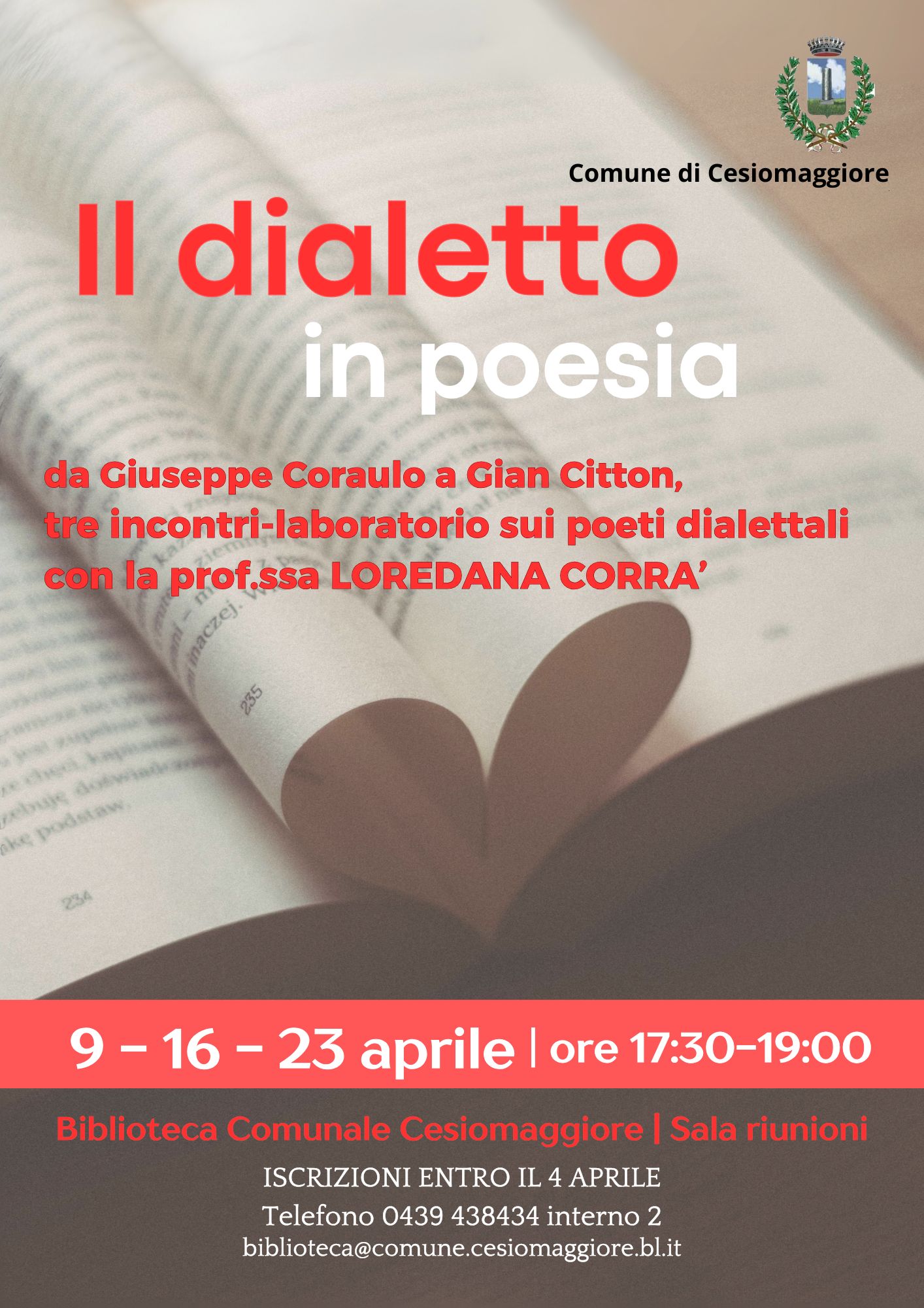 Si tratta di un laboratorio sui poeti che scrivono i loro componimenti in dialetto, partendo da Bartolomeo Cavassico, un notaio bellunese della prima metà del 1500, di cui sarà letta un’ode rustica. Saranno poi analizzati alcuni passi del Filò di Giuseppe Coraulo e della Predica del Paradis di Vittore Villabruna, due autori vissuti nella prima metà del 1700. Negli ultimi due incontri il focus si concentrerà su alcune poesie scritte da autori del Novecento. L'obiettivo è avvicinare alla poesia dialettale bellunese, sconosciuta ai più, non solo attraverso la teoria, ma facendone esperienza diretta. I partecipanti, infatti, saranno invitati a lavorare in piccoli gruppi sull'analisi del testo.
